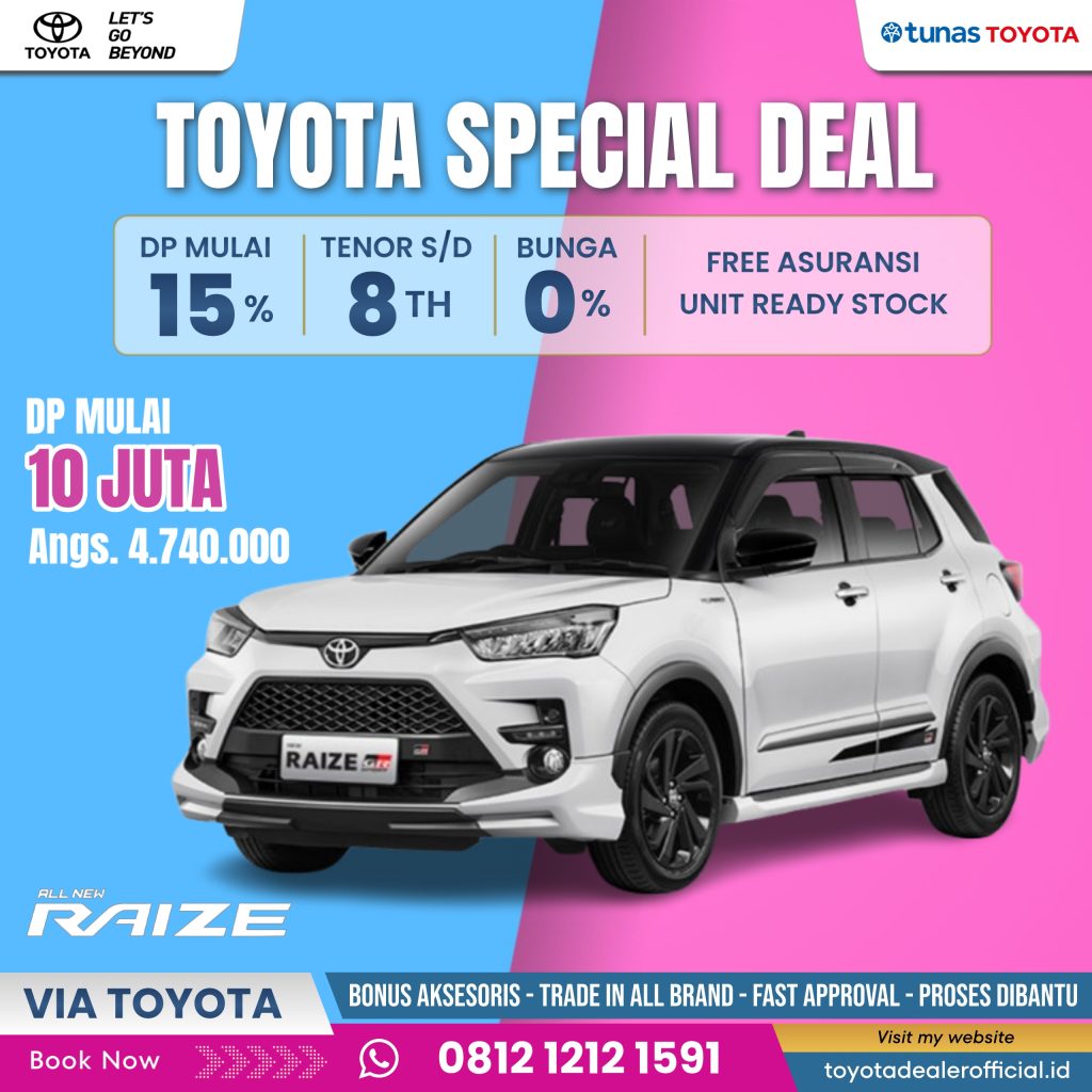 Temukan beragam Program Promo, Daftar Harga dan Paket Kredit pembelian mobil Toyota Raize di Bulan ini dan segera miliki mobil Toyota Impian anda.